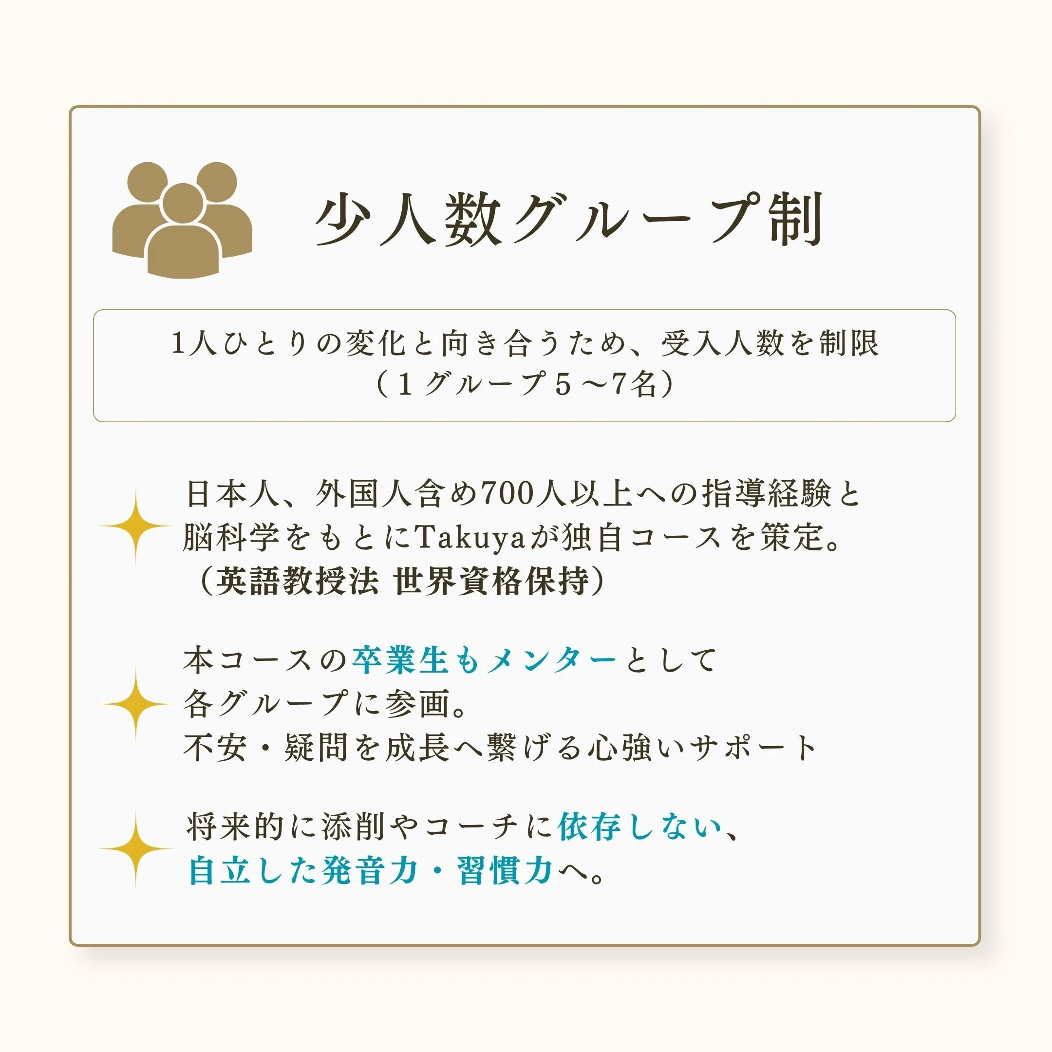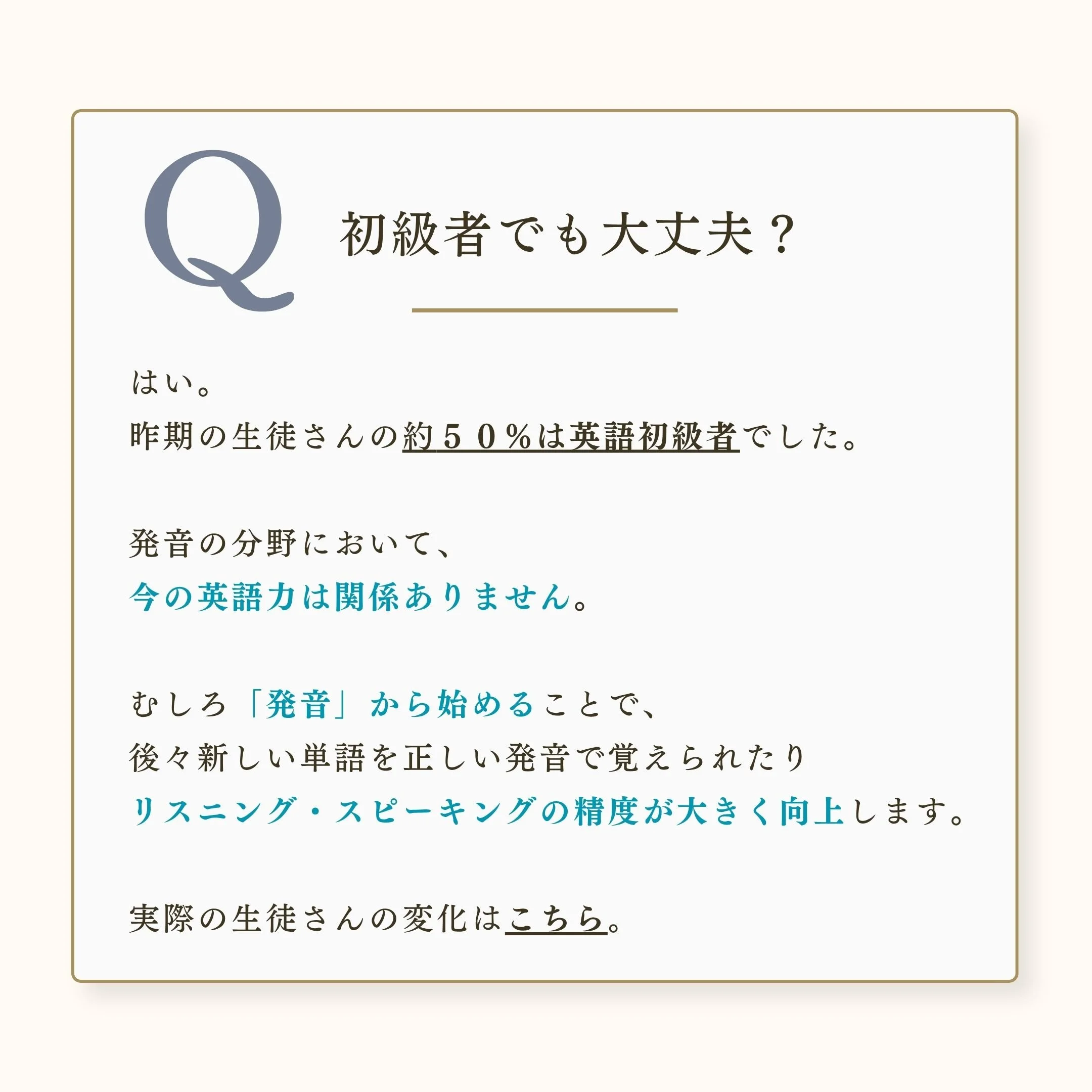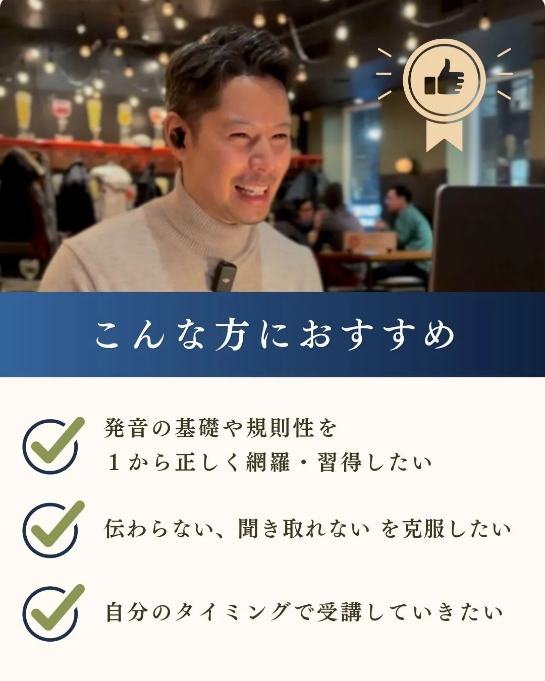 初級者〜上級者まで、全レベルの方に受講いただけます。初級の方は、今後単語や言い回しを覚えていく上で、正しい音で理解できるようになるので、リスニング・スピーキングの精度が大きく向上します。中級以上の方は、「自分の英語が伝わらない・ネイティブの英語についていけない」という壁を発音で克服し、このコースでさらに上のステップへと進めます